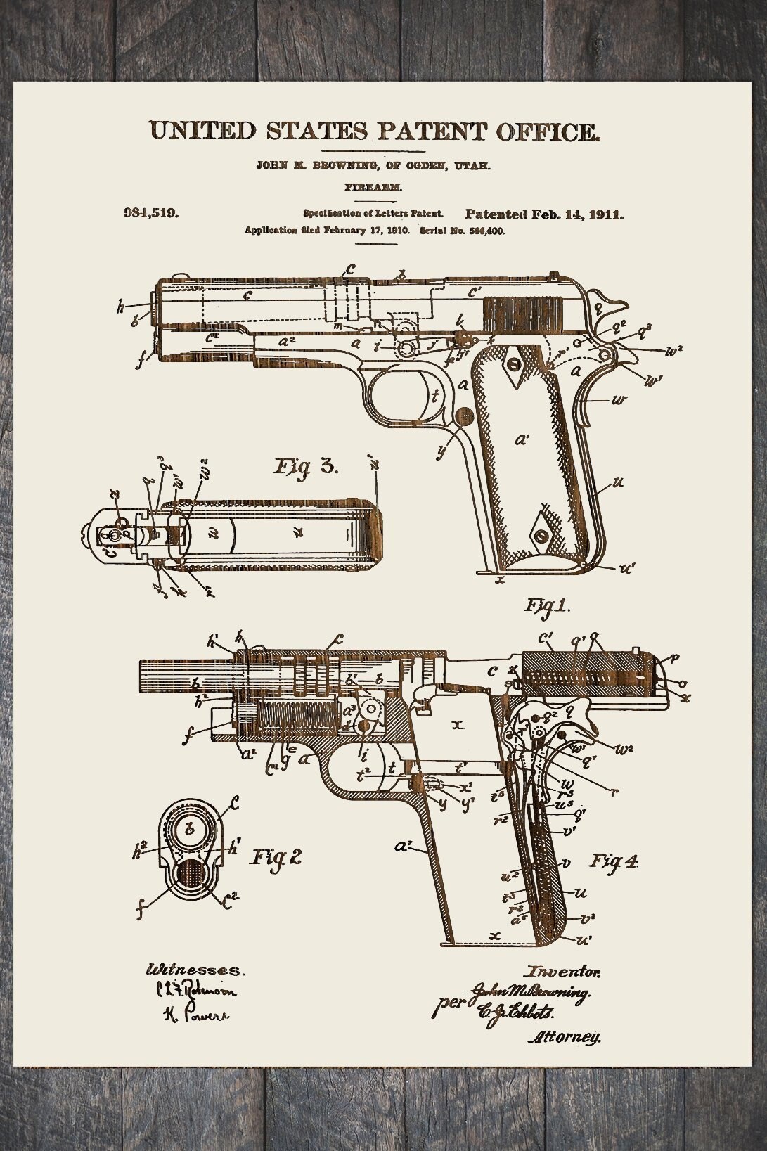The History of the 1911 Pistol The Model 1911 .45 Automatic Pistol is the world’s most respected handgun and has been designated by many authorities as the finest service pistol design of all time. The Browning 1911 was yet another revolutionary gun by one of the greatest gun designers of all time, John Moses Browning, the founder of today’s Browning Arms Company. John Moses Browning, a legendary firearms designer, designed the Browning pistol in the early 1900s. The US Army adopted the design on March 29, 1911, and it became known as the Model 1911. The US Navy and US Marine Corps adopted the pistol in 1913. The M1911 was the standard-issue sidearm for the US Armed Forces from 1911 to 1985, and was used in combat in World War I, World War II, the Korean War, and the Vietnam War. The M1911A1 version was replaced by the 9mm Beretta M9 pistol in 1985, but the M1911A1 has never been completely phased out. The M1911 is a .45 ACP caliber pistol, which was developed because of the need for a more effective cartridge. The M1911 is now the most copied pistol design in the world. Based on the short recoil principle of operation, the John M. Browning design for the US Military pistol trials was a magazine-fed, single-action semi-automatic pistol with both manual and grip safeties that demonstrated a level of durability, simplicity and reliability that no other pistol design of the era could match. In fact, during a 6,000-round test-fired over two days in 1910 that was personally supervised by John M. Browning, his sample pistol became so hot that it was simply dunked in a pail of water to cool it for further firing. Browning’s sample reportedly passed the test with no malfunctions.