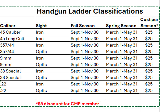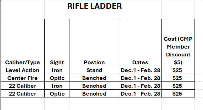 This type of competition has many benefits that can be enjoyed by all levels of shooters. The ladder is sponsored by the local CMP 24952.