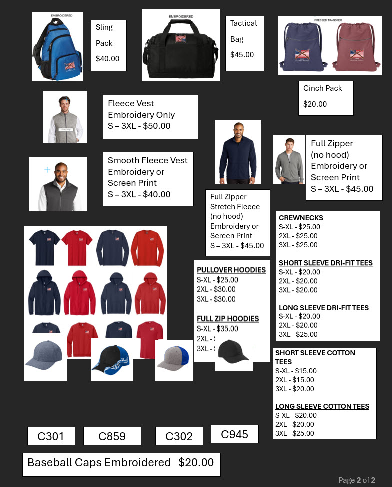 *Possibly in the future the chapter must have a total of twenty-five items on order before we can proceed with the printing of the items. It does not have to be all the same items, just a total of twenty-five items. Once we have a complete order, you will be contacted about payment of your order.